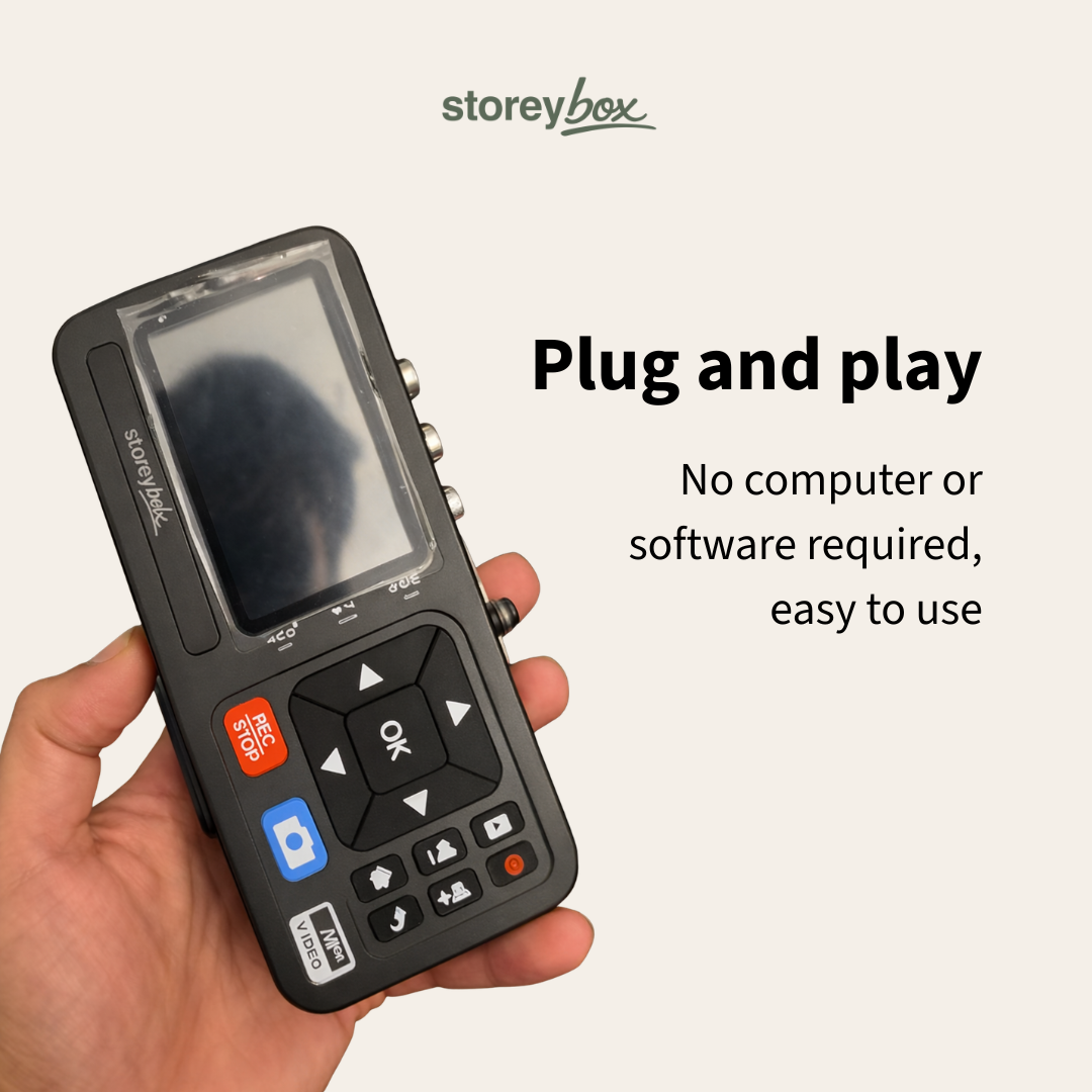 Storey Box records directly to USB or SD card. No complicated software or laptops.