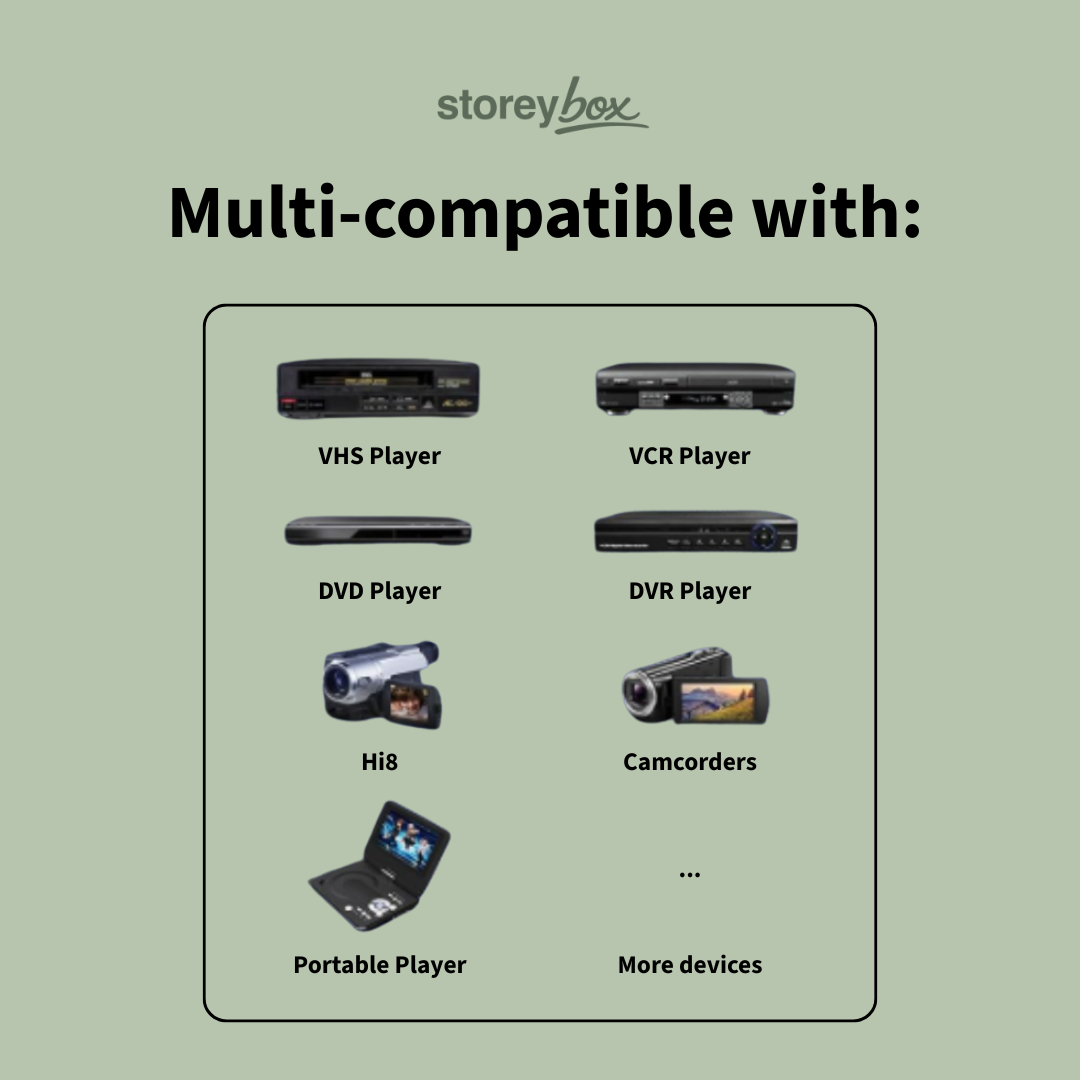 Storey Box works with more than just VHS tapes. Compatible with VHS, VCR, DVR, DVD, Hi8, Mini DV Players, Camcorder, Gaming Consoles. Whether it’s a family home video or an old movie, you can convert it into a digital file.